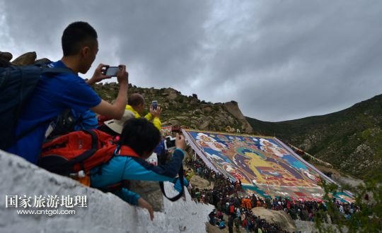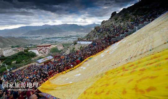 國(guó)家旅游地理 西藏拉薩8月6日訊 8月6日,拉薩哲蚌寺舉行展佛儀式。當(dāng)日,以西藏最大的格魯派寺廟哲蚌寺展佛為開端的雪頓節(jié)在拉薩拉開序幕。每年藏歷六月底七月初是西藏傳統(tǒng)的節(jié)日“雪頓節(jié)”。在藏語中,“雪”是酸奶子的意思,“頓”是“吃”“宴”的意思,“雪頓節(jié)”按藏語解釋就是吃酸奶子的節(jié)日,因此又叫“酸奶節(jié)”。因?yàn)?ldquo;雪頓節(jié)”期間有隆重?zé)崃业牟貞蜓莩龊鸵?guī)模盛大的曬佛儀式,所以有人也稱之為“藏戲節(jié)”“曬佛節(jié)”。 /新華社記者 普布扎西攝