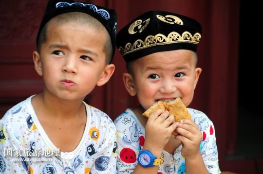 8月8日,兩名穆斯林兒童在山東省臨沂市郯城縣馬頭鎮(zhèn)清真寺吃傳統(tǒng)美食——油香。