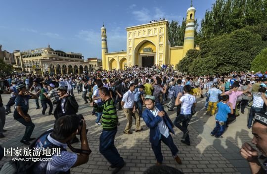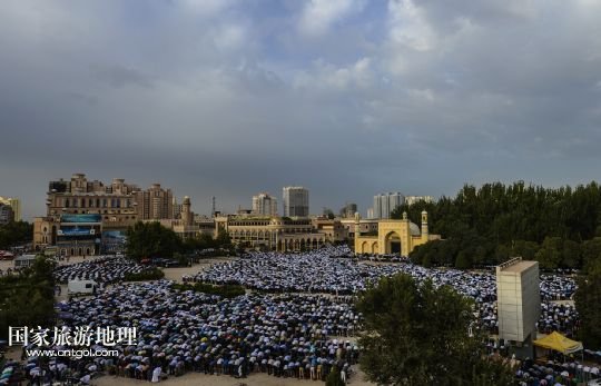 當(dāng)日,近3萬名各族穆斯林群眾前往新疆最大清真寺——艾提尕爾清真寺做禮拜,喜迎開齋節(jié)。