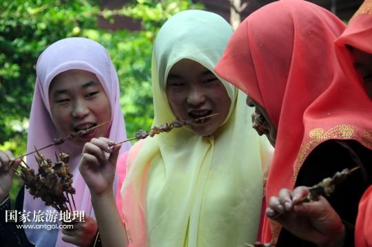 8月8日,幾名穆斯林女孩在山東省臨沂市郯城縣馬頭鎮(zhèn)清真寺品嘗美食。