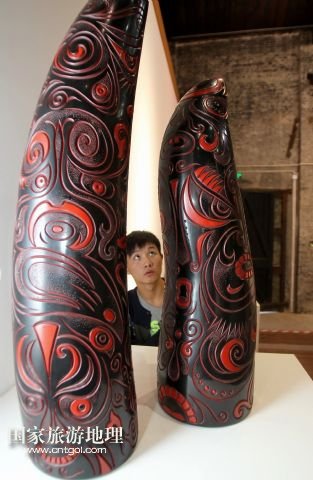 9月6日,一名參觀者在中國當(dāng)代漆藝展上欣賞由大漆、布脫胎制作的作品《圖騰柱》。