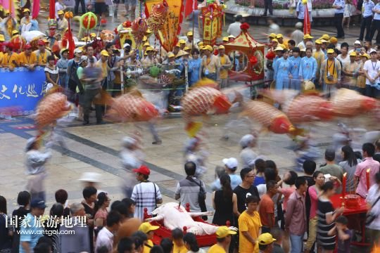 國家旅游地理 浙江寧波9月14日訊 9月14日,在浙江省寧波市象山縣,當(dāng)?shù)貪O民在進(jìn)行漁區(qū)民俗文化表演。當(dāng)日,浙江寧波象山縣舉行漁區(qū)民俗文化巡展,魚燈、馬燈、百獸燈、船燈等13支表演隊(duì)為游客奉獻(xiàn)了精彩的民俗表演,展現(xiàn)了象山燦爛的民俗文化和獨(dú)特的海洋風(fēng)情。 /新華社發(fā)(張培堅(jiān) 攝)