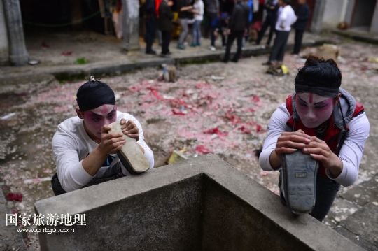 國家旅游地理 江西九江4月2日訊 在溪口鎮(zhèn)小溪村,三元班在演出寧河戲《三請樊梨花》(3月26日攝)。寧河戲是江西地方大型古老劇種之一,發(fā)源于江西修水縣,流行于贛北及湘、鄂、贛交界一帶。在寧河戲鼎盛的清乾隆年間,曾出現(xiàn)過“寧州十八班”,從業(yè)人員達(dá)到六七百人。然而隨著時(shí)代的變遷,寧河戲逐步?jīng)]落,最大的危機(jī)是逐漸空心化的村莊和村莊里越來越少的老戲迷。