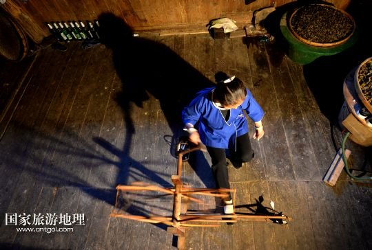 5月14日,高友村村民楊華梅在家里用紡紗機織布。