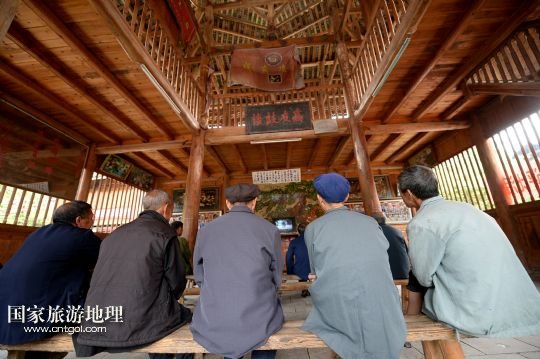 5月14日,高友村的老人們聚在鼓樓里看電視。