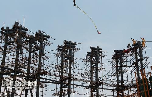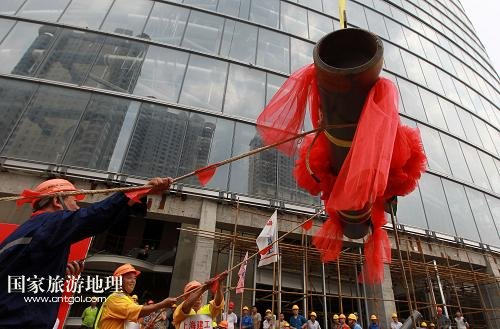 國家旅游地理 上海8月3日訊 8月3日,上海機(jī)械施工集團(tuán)公司的工程人員指揮最后一榀桁架的吊裝。當(dāng)日上午,隨著塔冠結(jié)構(gòu)中最后一榀鰭狀桁架緩緩起吊并安裝到位,歷時(shí)近6年建設(shè)的“上海中心”按計(jì)劃順利達(dá)到設(shè)計(jì)高度632米,刷新了“申城之巔”的新紀(jì)錄。據(jù)介紹,“上海中心”2014年年底將實(shí)現(xiàn)除酒店精裝修部分外的土建竣工,2015年年中將投入運(yùn)營。新華社記者 裴鑫 攝
