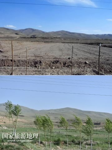 國(guó)家旅游地理 寧夏中衛(wèi)6月9日訊 上圖上:2014年5月的資料照片上甘鹽池一片荒涼;上圖下:6月4日,記者拍攝的甘鹽池已是綠意盎然(拼版照片)。寧夏海原縣甘鹽池地處黃土高原干旱帶上,平均海拔約2100米,年均降雨量在280毫米左右,自然災(zāi)害頻繁,十年九旱。2014年以前,這片近12萬(wàn)畝的土地可謂一片荒蕪。2014年,海原縣甘鹽池管委會(huì)通過(guò)確立“盆地改良、種草養(yǎng)羊、綠化美化、提升人氣”的工作思路,對(duì)2.2萬(wàn)畝砂石地和山坡地進(jìn)行改良和治理,如今甘鹽池滿(mǎn)滿(mǎn)的綠意讓人為之一振。 新華社記者 李然 攝