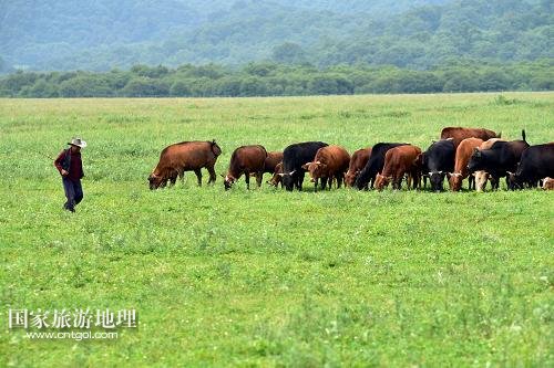7月13日,農戶在神農架大九湖高山濕地放牛。